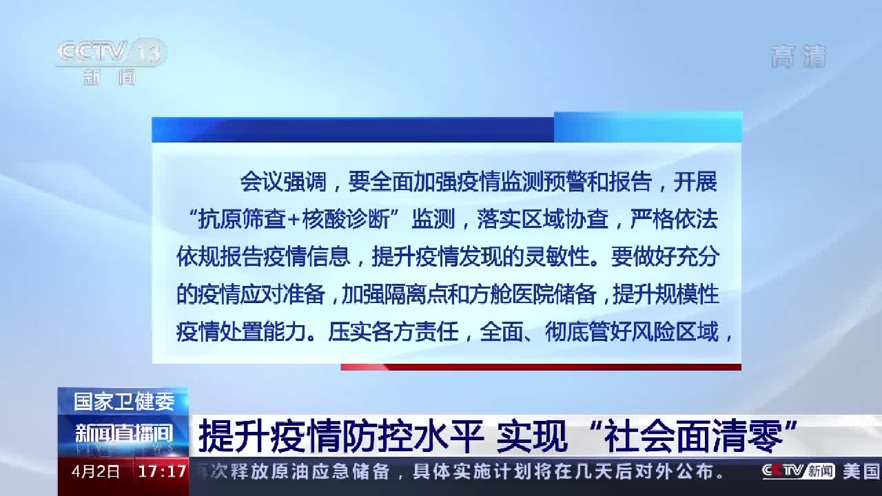 國家衛生健康委昨天(4月1日)召開全國衛生健康系統新冠肺炎疫情防控工作電視電話會議,強調要全面提升疫情防控水平,確保如期實現“社會面清零”目標。