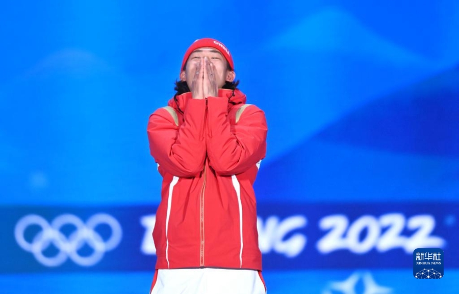 2月15日,在北京賽區頒獎廣場,冠軍中國隊選手蘇翊鳴在北京2022年冬奧會單板滑雪男子大跳臺獎牌頒發儀式上。新華社記者 黃宗治 攝