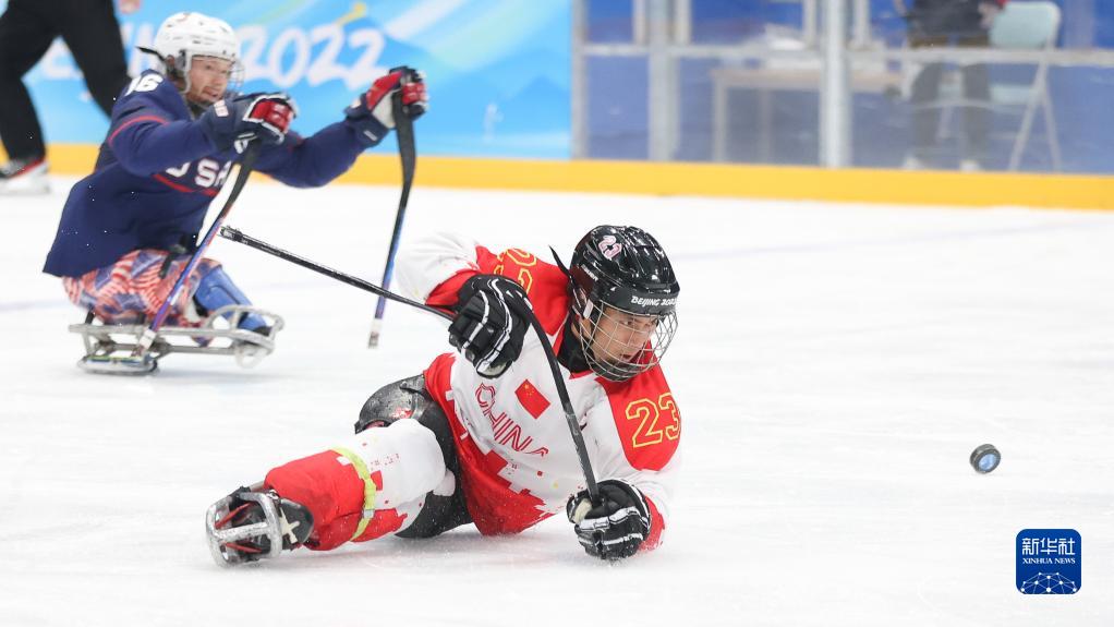 3月11日,在北京國家體育館,中國隊球員崔玉濤(右)在北京2022年冬殘奧會殘奧冰球半決賽中。新華社記者 馬希平 攝
