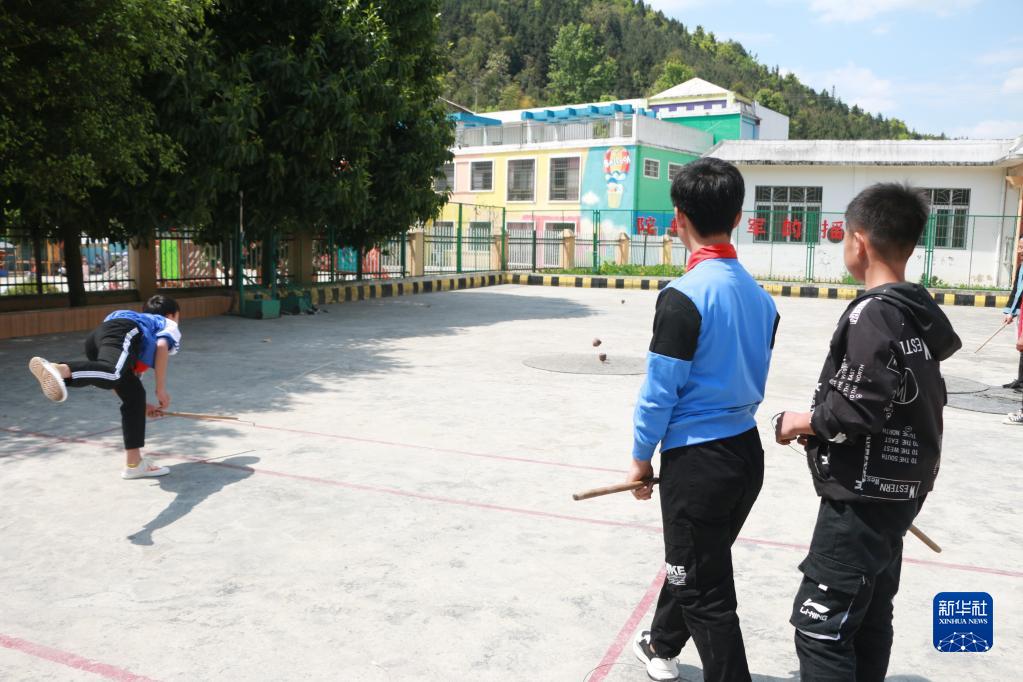 瑤山民族小學的學生在練習競技陀螺(4月6日攝)。新華社記者 齊健 攝