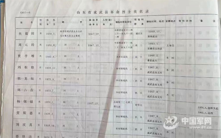 文章中注明“焦像田”烈士的原籍是“成武縣九女榮村”,成武縣退役軍人事務局經過摸排,發現現在的九女集鎮并沒有“榮村”這一地名。是否是解放前的地名?還是解放后行政區劃更改了?查閱成武縣烈士英名錄、史志和軍事志等資料的同志,翻遍了有關檔案也沒有見到這個烈士名字。他們與淮海戰役烈士陵園聯系,進一步了解烈士信息,并通過走訪老兵,在縣有關媒體轉發尋親信息等方式,開展了社會化尋找。一天下來,沒有任何線索。