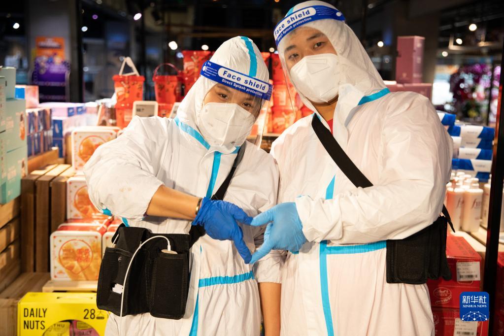 4月15日,在上海長(zhǎng)寧區(qū)盒馬星空廣場(chǎng)門店,曹冉(右)和徐清秋比出愛(ài)心。