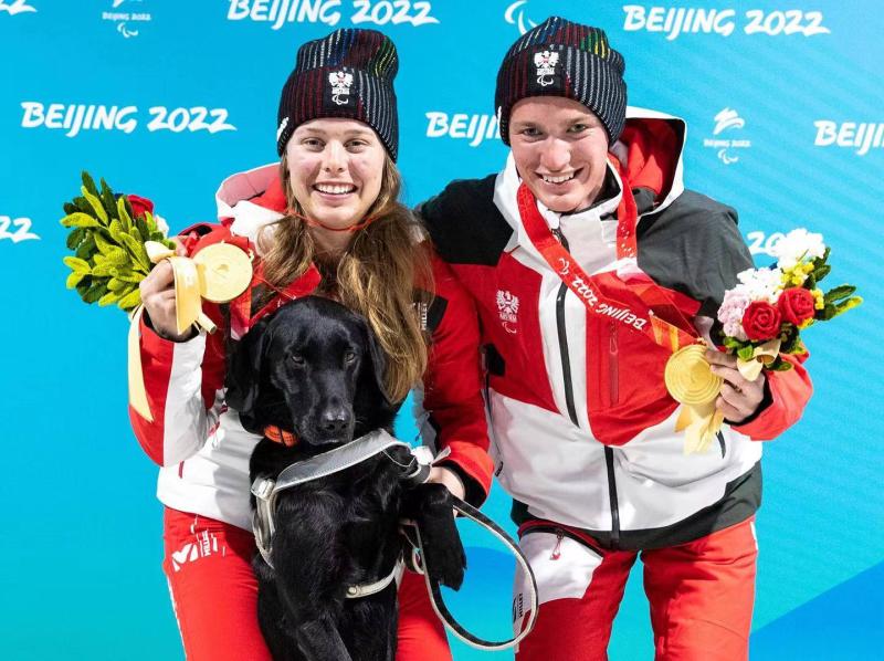 ↑埃德林格(左)與引導(dǎo)員、導(dǎo)盲犬一同站上領(lǐng)獎(jiǎng)臺