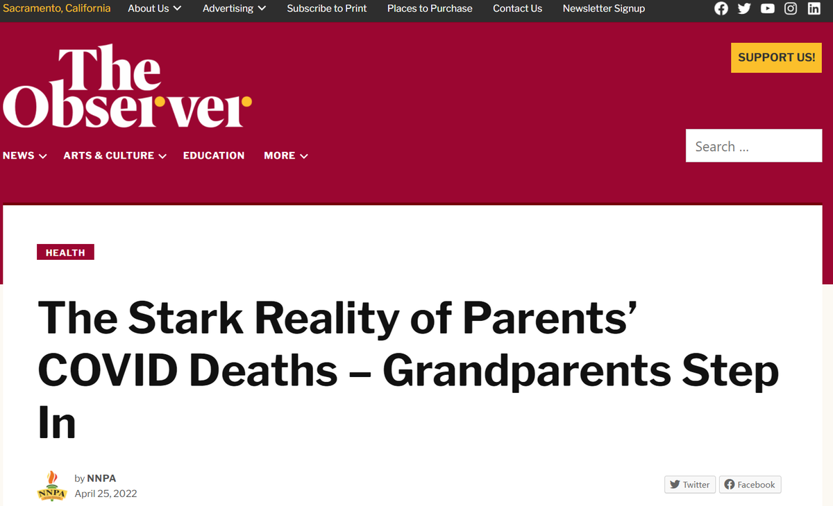 中國日報(bào)網(wǎng)5月1日電 據(jù)美國《薩克拉門托觀察家報(bào)》(The Sacramento Observer)網(wǎng)站報(bào)道,近日新發(fā)布的報(bào)告顯示,美國有20萬兒童因新冠疫情失去父母。當(dāng)年幼的孤兒面臨如此不幸的悲劇時(shí),許多年邁的祖父母不得不承擔(dān)起主要看護(hù)者的角色。而這些“新冠孤兒”中,有色人種兒童的占比更高。
