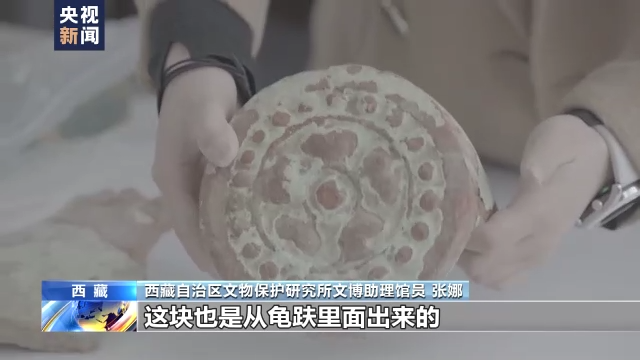 西藏自治區(qū)文物保護研究所文博助理館員 張娜:這個瓦當?shù)脑捠峭诰虺鰜碜钔暾囊粋,這一塊也是從龜趺里面出來的一塊大的板瓦,這是我們這次出土最大的板瓦。