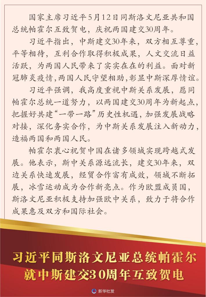 新華社北京5月12日電 國家主席習近平5月12日同斯洛文尼亞共和國總統帕霍爾互致賀電,慶祝兩國建交30周年。
