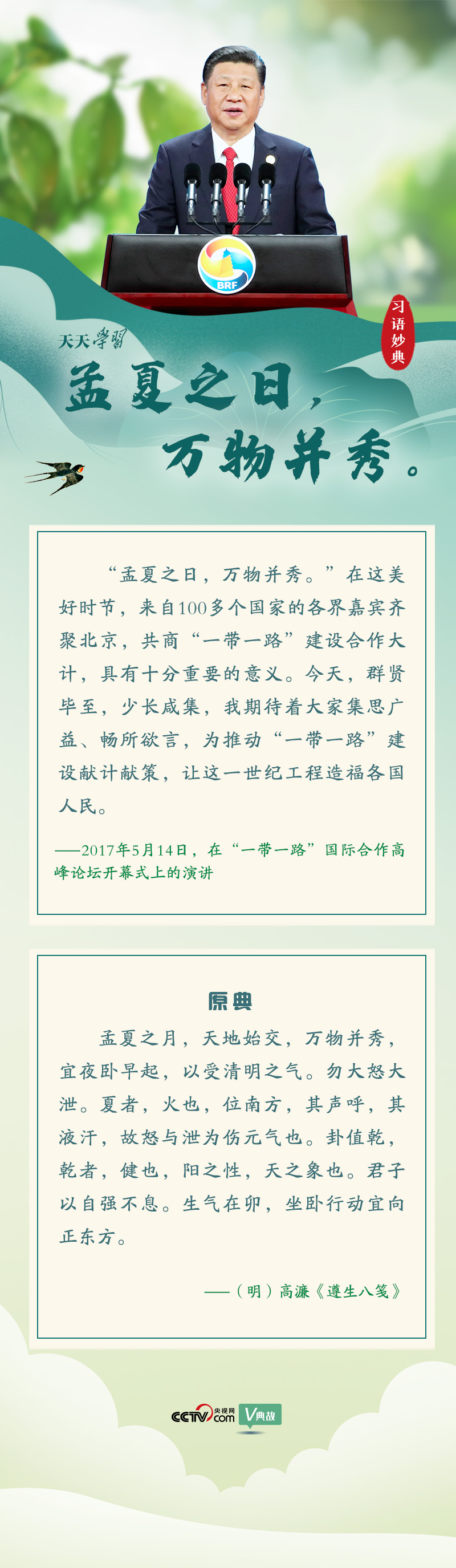 2017年5月14日,習近平主席在北京出席“一帶一路”國際合作高峰論壇開幕式,并發表題為《攜手推進“一帶一路”建設》的主旨演講。開幕式當天是農歷四月十九日,適值“孟夏之日”。此時的北京初夏剛至,風暖晝長,陽光明媚,藍天、白云、山水和古建筑相映成趣,大地郁郁蔥蔥,一片生機盎然。在演講開場白中,習近平主席將古人成句“孟夏之月,萬物并秀”信手拈來,易“月”為“日”,與眼前萬物勃發、生機盎然的京城美景相呼應,也讓與會嘉賓們感受到中國人民的熱情,堪稱妙用天成。