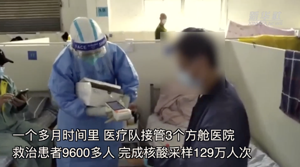 一個多月時間里,醫療隊接管3個方艙醫院,救治患者9600多人,完成核酸采樣129萬人次。