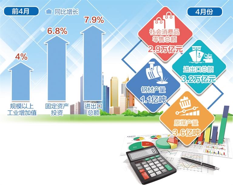 4月份,社會消費品零售總額達2.9萬億元,進出口總額達3.2萬億元。從累計看,全國主要指標仍保持增長。前4月規(guī)模以上工業(yè)增加值同比增長4%,固定資產(chǎn)投資和進出口總額分別增長6.8%和7.9%。