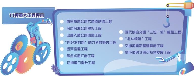 重大工程項目包涉及國家高速公路大通道聯(lián)通工程、沿邊沿海公路建設(shè)工程、出疆入藏公路通道工程、“四好農(nóng)村路”助力鄉(xiāng)村振興工程、運(yùn)河連通工程、黃金水道擴(kuò)能工程、沿海港口提升工程、現(xiàn)代綜合交通“三位一體”樞紐工程、“北斗領(lǐng)航”工程、交通運(yùn)輸新基建賦能工程、綠色低碳交通可持續(xù)發(fā)展工程11項。