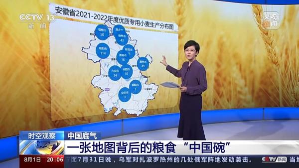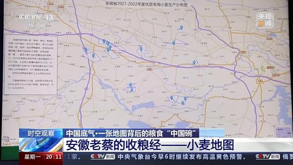今年安徽夏糧總產(chǎn)量達(dá)1722.4萬噸,居全國第3位;比2021年夏糧增產(chǎn)22.5萬噸,增量居全國第2位,全省夏糧呈現(xiàn)面積、單產(chǎn)、總產(chǎn)和效益“四增”的特點(diǎn)。占比74%的優(yōu)質(zhì)專用小麥,助力增產(chǎn)。再回到老蔡,作為糧食經(jīng)紀(jì)人,還差20萬畝的小麥?zhǔn)召從繕?biāo),老蔡決定主動(dòng)出擊。究竟去哪里能收購到優(yōu)質(zhì)小麥呢,老蔡的收糧經(jīng)里的第三個(gè)關(guān)鍵詞出現(xiàn)了:地圖。