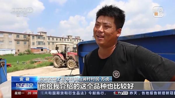 安徽潁上縣陳橋鎮(zhèn)山澗村村民 萬虎:今年趕個(gè)豐收年,我的收成也比較滿意,他給我介紹的這個(gè)品種也比較好。