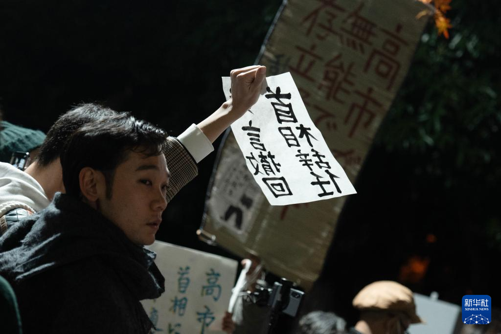 11月21日,在日本東京的首相官邸外,民眾參加抗議活動(dòng)。新華社記者 賈浩成 攝