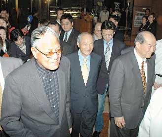 李登輝(左)昨晚宴請“獨派”人士,臺當局前“中選會主委”黃石城(中)也受邀,李登輝認為要解決臺灣當前政治危機最優(yōu)先的辦法,就是“政局重組,建立本土派的第三勢力”。《聯(lián)合報》記者林建榮攝
