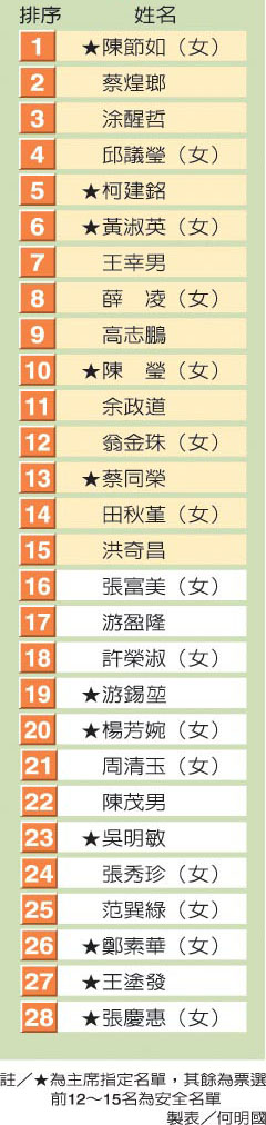 在黨主席指定名單中,除了陳節(jié)如之外,可說是乏善可陳,安全名單內(nèi)沒有勞工代表,沒有專業(yè)人士,都是民進(jìn)黨內(nèi)的政治人物、現(xiàn)任“立委”,了無新意,唯一的勞工代表鄭素華卻被排名在第26名,根本上不了。