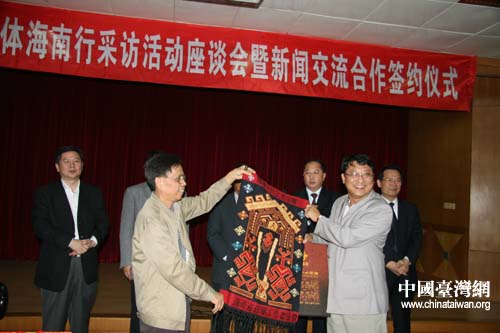 海南省新聞工作者協會副主席兼秘書長郭澤福、《海南日報》副總編廉振孝、海南廣播電視臺副臺長李公羽先后發言,向來訪的臺灣同行介紹了海南省新聞工作者協會和海南媒體的基本情況。
