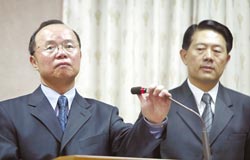 臺(tái)當(dāng)局“國(guó)安局長(zhǎng)”許惠佑、“特勤中心”副指揮官?gòu)堦剑ㄓ遥?0日參加臺(tái)“立法院”會(huì)議,針對(duì)2008選舉參選人安全議題時(shí)表示,特勤警衛(wèi)對(duì)象如果發(fā)生安全情況,情治首長(zhǎng)都引咎下臺(tái)。但他強(qiáng)調(diào),他說(shuō)這些話是有信心做好維安工作。(臺(tái)灣《中國(guó)時(shí)報(bào)》圖)