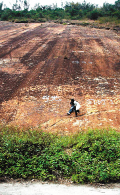 南投縣的“粗坑大峭壁”是知名天然奇景,常有游客攀爬拍照,甚至用白漆噴字留念,破壞了大自然景觀,令當地居民覺得可惜。(聯合報圖)