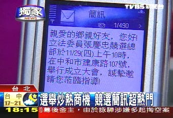 短信方便又省廣告印刷費(fèi),成了藍(lán)綠參選人都愛用的助選奇兵。國民黨“立委”邱毅說:“現(xiàn)在短兵相接了,所以什么錢幾乎都是要花的,(我之前的選區(qū))發(fā)一次短信,就需要花掉18.78萬元。”