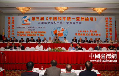 中國(guó)臺(tái)灣網(wǎng)1月19日馬尼拉消息 由菲律賓中國(guó)和平統(tǒng)一促進(jìn)會(huì)主辦的第三屆“中國(guó)和平統(tǒng)一亞洲論壇”于今天上午在馬尼拉世紀(jì)花園酒店開(kāi)幕。