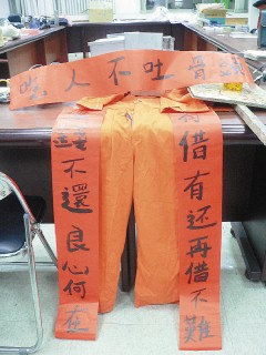 警方經長期搜證后,昨天逮獲林正崇等人,查扣棍棒、電擊棒、油漆等,其中最特別的證物就是一堆寫好的“恐嚇春聯”。最近因年關臨近,林正崇想出用“恐嚇春聯”觸人霉頭,不少債務人怕被貼,乖乖還錢。(周先)