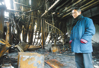 火熄了,云門舞集總監(jiān)林懷民走進燒塌了的排練場,看著化為灰燼的心血沉思。(聯(lián)合報圖)