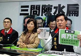 國(guó)民黨“立法院”黨18日再度針對(duì)臺(tái)當(dāng)局籌設(shè)鐽震公司發(fā)表看法并三問(wèn)陳水扁,同時(shí)呼吁“國(guó)防部長(zhǎng)”李天羽勿成“A錢的幫兇”。臺(tái)灣東森新聞?dòng)浾咧旒覐⿺z