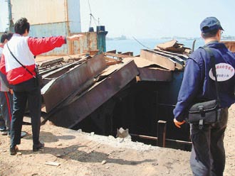 “朝國6號”昨天進行甲板焊切工程時發生氣爆,甲板被炸開一個大洞,造成2名工人死亡,警方在現場勘驗。(臺灣《聯合報》記者包希勝攝 )