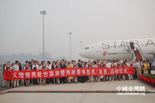 中國臺灣網(wǎng)7月4日北京消息 今天早上8時許,北京首都國際機場舉行大陸居民赴臺旅游暨兩岸周末包機北京航點啟動儀式。機組成員在停機坪熱烈歡送赴臺游首發(fā)團成員。