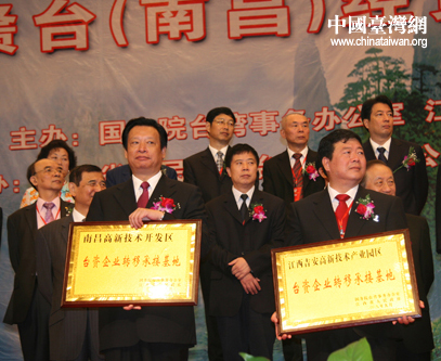 在儀式上,為此次設(shè)立的5個(gè)臺(tái)資企業(yè)轉(zhuǎn)移承接基地和5家臺(tái)商創(chuàng)業(yè)園進(jìn)行了授牌。它們分別是:南昌高新技術(shù)開發(fā)區(qū)臺(tái)資企業(yè)轉(zhuǎn)移承接基地、南昌經(jīng)濟(jì)技術(shù)開發(fā)區(qū)臺(tái)資企業(yè)轉(zhuǎn)移承接基地、江西贛州經(jīng)濟(jì)開發(fā)區(qū)臺(tái)資企業(yè)轉(zhuǎn)移承接基地、江西吉安高新技術(shù)產(chǎn)業(yè)園區(qū)臺(tái)資企業(yè)轉(zhuǎn)移承接基地、江西上饒經(jīng)濟(jì)開發(fā)區(qū)臺(tái)資企業(yè)轉(zhuǎn)移承接基地,以及江西撫州金巢經(jīng)濟(jì)開發(fā)區(qū)臺(tái)商創(chuàng)業(yè)園、江西共青城臺(tái)商創(chuàng)業(yè)園、江西上高臺(tái)商創(chuàng)業(yè)園、江西瑞金臺(tái)商創(chuàng)業(yè)園、江西向塘臺(tái)商創(chuàng)業(yè)園。