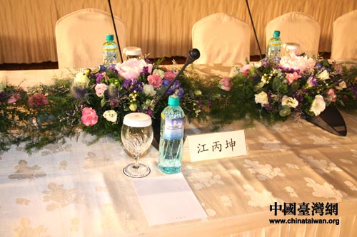 二次“陳江會”即將于4日上午9點開始,現場一切就緒。圖為江丙坤的坐席。中國臺灣網 田云鵬攝
