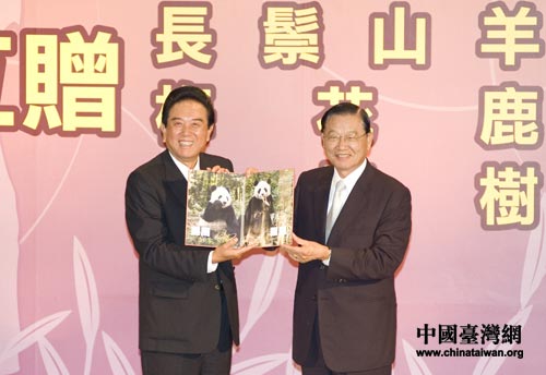 陳云林江丙坤舉行互贈(zèng)儀式,陳云林向江丙坤贈(zèng)送“團(tuán)團(tuán)”、“圓圓”圖譜,江丙坤向陳云林贈(zèng)送長(zhǎng)鬃山羊和梅花鹿圖譜。(本網(wǎng)特派記者田云鵬 發(fā)自臺(tái)北)