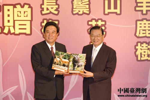 陳云林江丙坤舉行互贈(zèng)儀式,江丙坤向陳云林贈(zèng)送長(zhǎng)鬃山羊和梅花鹿圖譜。中國臺(tái)灣網(wǎng) 田云鵬攝