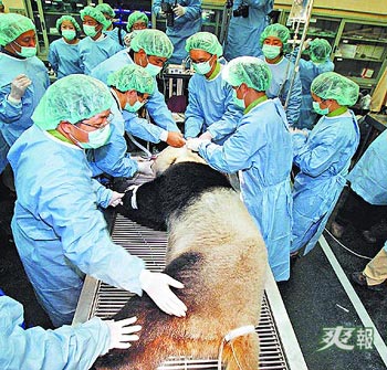 臺北市立動物園昨首度為大熊貓“圓圓”做健康檢查,圖為全身麻醉的“圓圓”躺在手術(shù)臺,由31名專家大會診。來源:臺灣《爽報》