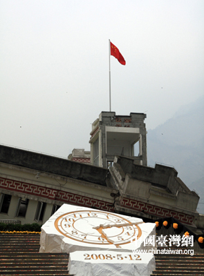 位于映秀鎮(zhèn)最東頭的漩口中學(xué)遺址,紀(jì)念鐘的時(shí)間定格在2008年5月12日14點(diǎn)28分。紀(jì)念鐘后,漩口中學(xué)廢墟上五星紅旗迎風(fēng)飄揚(yáng)。12日,這里舉行了地震一周年紀(jì)念活動(dòng)。 (中國(guó)臺(tái)灣網(wǎng) 田云鵬 攝)