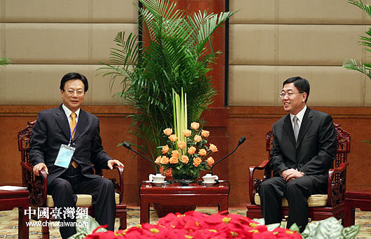 國家旅游局副局長杜江26日會見來京營銷農特產品和旅游的臺中市、彰化縣、臺中縣、南投縣主要負責人。杜江同彰化縣縣長卓伯源交談。(中國臺灣網 鐘寶華 攝)