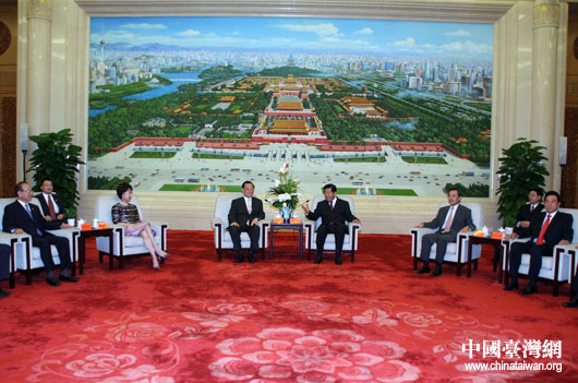 7月27日下午,中共中央政治局常委、全國政協主席賈慶林在北京人民大會堂北京廳會見了來訪的中國國民黨榮譽主席連戰一行。(中國臺灣網 鐘寶華 攝)