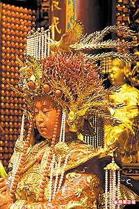 邱嘉進說,媽祖和鳳冠都是請臺北縣三峽鎮(zhèn)的雕刻師傅賴威佑設計雕刻,共花了兩年半時間,神尊上月底完工迎回廟內(nèi)供奉,昨為神尊戴上鳳冠,對信眾來說“是無價之寶”!