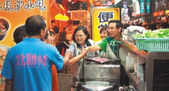 民進(jìn)黨主席蔡英文(右二)與嘉義市長候選人涂醒哲(右一)昨晚在嘉義市文化路掃街拜票。來源:臺灣《聯(lián)合報》
