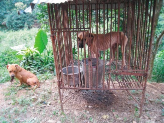 高雄縣旗山鎮(zhèn)一處私人犬只繁殖場內,兩只原本應該雄糾糾的斗犬,餓到皮包骨,看到人靠近還會發(fā)生害怕的低鳴。來源:臺灣《聯(lián)合報》
