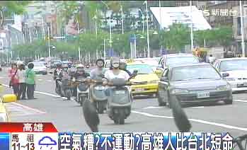 高雄市民騎著摩托車不得不戴上口罩,高雄市民似乎很習慣,但這樣的空氣質量可能已經影響到壽命長短。空氣不好是公認的高雄人短命的主因。根據去年臺當局“內政部”公布的生命表,臺北人平均可以活到81.87歲,其它五縣市平均也有78.92歲。不過住在高雄市的人,平均只能活到78.21歲,整整少了臺北人3歲。