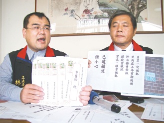國(guó)民黨政策會(huì)執(zhí)行長(zhǎng)林益世(左)拿出收到的“賄選已遭鎖定”信件,指控這是選舉奧步。 來(lái)源:臺(tái)灣《聯(lián)合報(bào)》