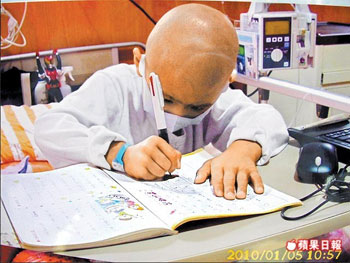 豆豆愛讀書,住院化療期間,學校老師也會到病床前教他功課。來源:臺灣《蘋果日報》