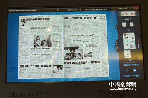 國家圖書館為代表委員提供的電子報紙閱讀機安放在駐地賓館的走廊里,極大的方便了代表委員及時了解各方面的信息。(中國臺灣網 肖春陽 劉洋 攝)