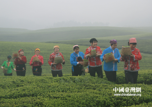 漫山遍野的茶樹翠色欲滴,美麗的采茶姑娘穿梭于茶樹之間,纖手拈芽,不亦樂乎。(中國臺灣網 李丹 攝)