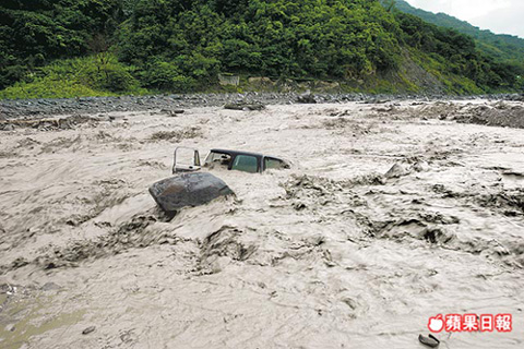 臺東嘉蘭村一輛吉普車原本要去幫忙拖陷在水中的車子,結(jié)果不慎反而被大水沖走,還好車上的人及時跳車,并無人員傷亡。圖片來源:臺灣《蘋果日報》