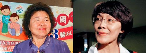 陳菊(左)習慣一襲罩衫、簡單內搭、戴一條單墜項練,頂著細卷的頭發,打出“花媽”名號!白儼l圖強”的黃昭順(右)昨天也改變造型,剪掉中長發、改換短發,展現親切風格。圖片來源:臺灣《聯合報》