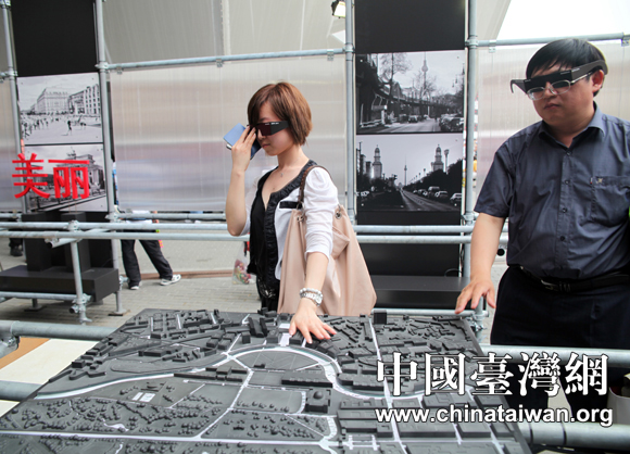 6月11日,兩名游客在上海世博園德國館外圍參加體驗項目——觀眾帶上眼罩,“閉上眼睛看”城市,游客借助可觸摸的城市模型,通過觸覺、聽覺去欣賞這些建筑和其所在的地區。(中國臺灣網 田云鵬 攝)