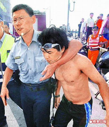 林身茂(右)體力耗盡,只能乖乖上岸,遭警方扭送法辦。圖片來(lái)源:臺(tái)灣《蘋(píng)果日?qǐng)?bào)》