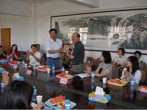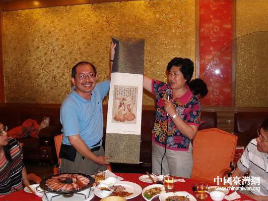 新疆臺(tái)辦主任李秉香向臺(tái)灣全教會(huì)贈(zèng)送禮品。圖片來源:新疆臺(tái)辦